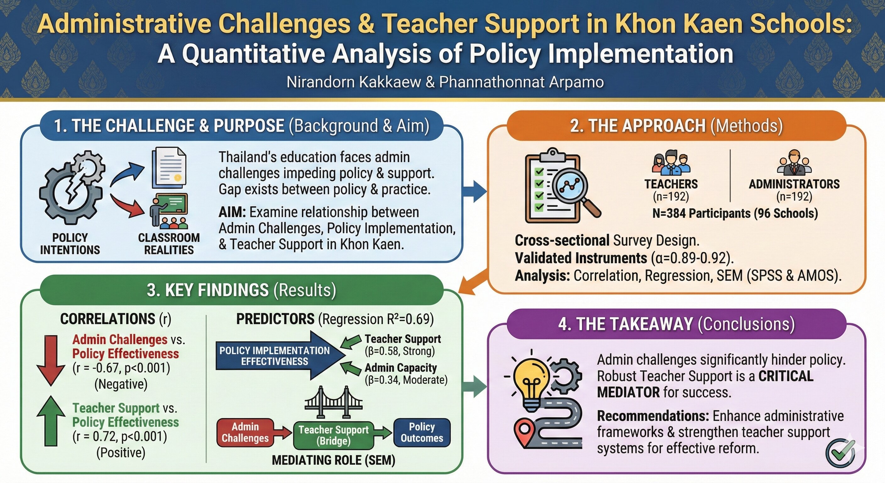 • Administrative Challenges and Teacher Support Mechanisms in Public Schools: A Quantitative Survey Analysis of Policy Implementation Effectiveness in Khon Kaen Province, Thailand